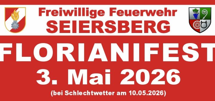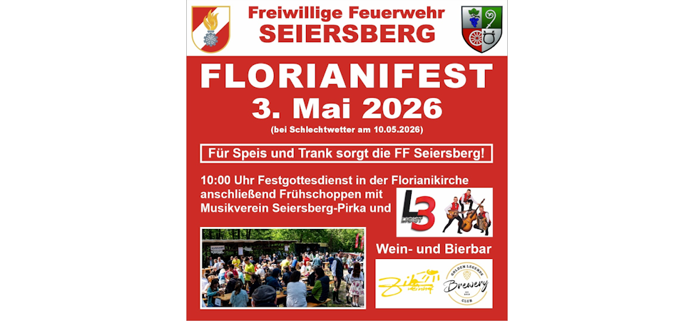 Am 3. Mai 2026 (bei Schlechtwetter am 10.05.2026) lädt die FreiwilligeFeuerwehr Seiersberg wieder zum traditionellen Florianifest auf den gleichnamigen Bergzwischen Straßgang und Seiersberg-Pirka. Mit dem Böllerschießen in den Morgenstunden, als Zeichen, dass unser Fest...