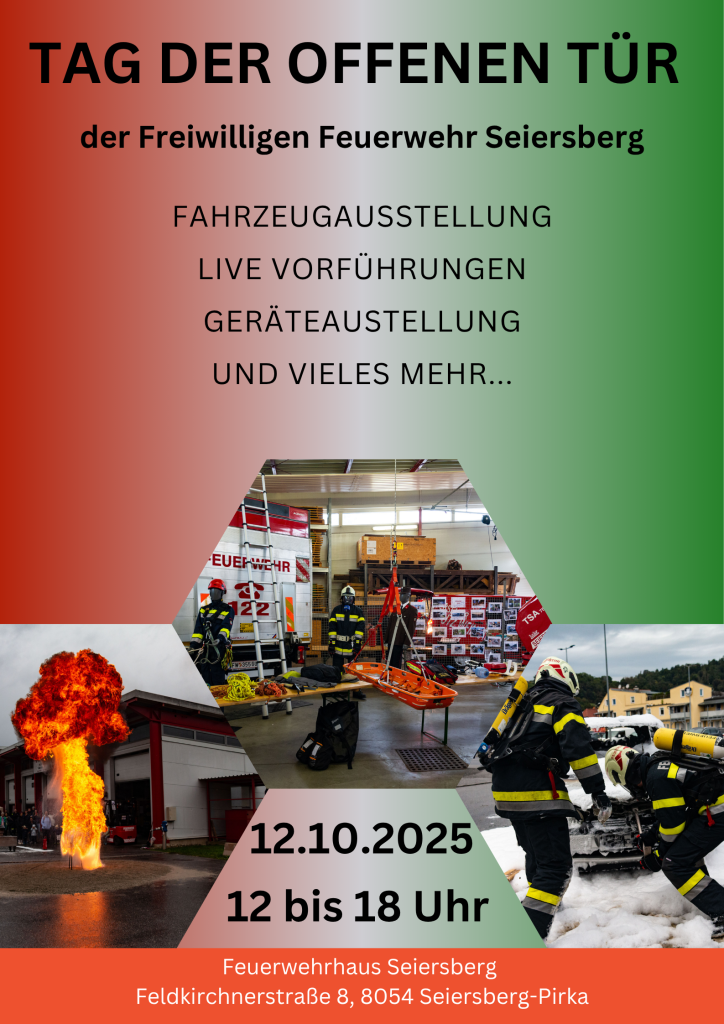 Datum: Sonntag, 12. Oktober 2025 Uhrzeit: 12:00 bis 18:00 Uhr Ort: Feuerwehrhaus Seiersberg, Feldkirchnerstasse 8, 8054 Seiersberg-Pirka